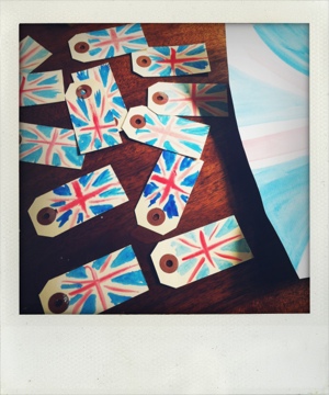We are painting tags and flags for the catseatdogs jewelry party tomorrow. As it is also the Queen’s Diamond Jubilee, we thought some hand painted flags and tags would be appropriate.