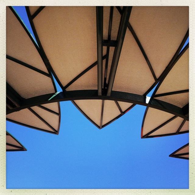 Day 11. ‘View’ The blue sky and the leaves of the seating area at a local park. We were waiting for the food trucks to set up so we could get dinner!