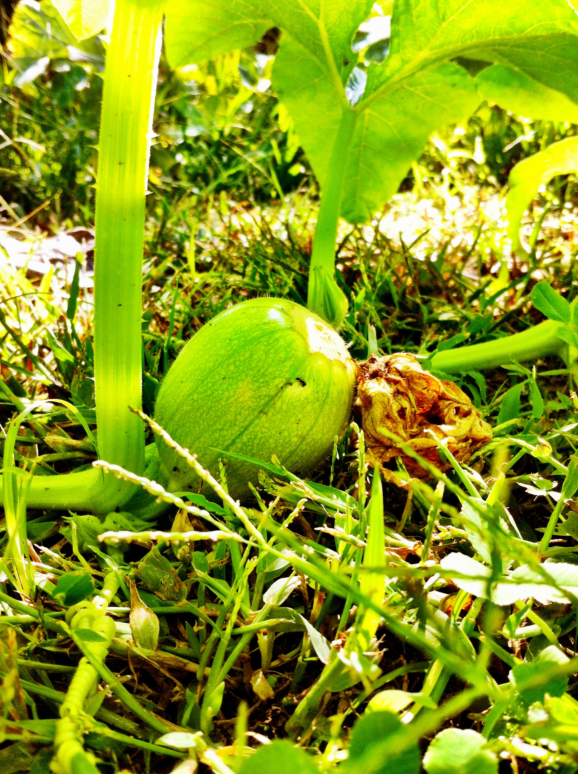 Day 19. ‘Underneath’ We have two pumpkins growing in our ‘patch’. This one is nestled underneath the umbrella leaves.