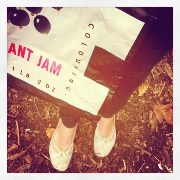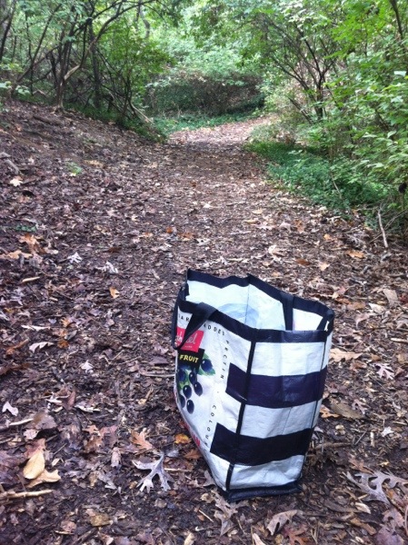 My destitute shoppping bag full of pumpkin bread ingredients and kids socks, waiting on the woodland path while I type into my phone!