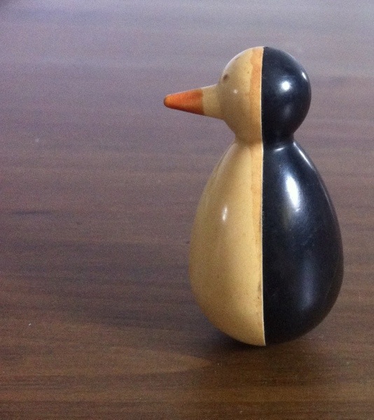 He was wobbling on his little weighted base on a ladder in the garage of the garage sale with a sticker on him nearly his size (he is only a couple of inches) which said 25c.