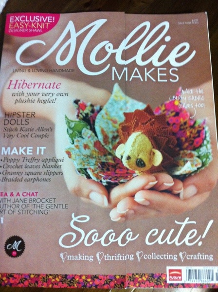 Onto Barnes and Noble to pick up a woefully old, Mollie Makes magazine, out of date because it is a UK publication and I assume it takes ages for it to flap those magaziney pages over here. Not to worry though, there are no horoscopes to go out of date, no celeb gossip to age, just lovely crafty stuff for me to look at and plan to make. When I can knit and crochet effectively…..I can use a sewing machine and a needle and thread, so all is not lost! I like the look of the itsy hedgehog on the cover, I can make him!