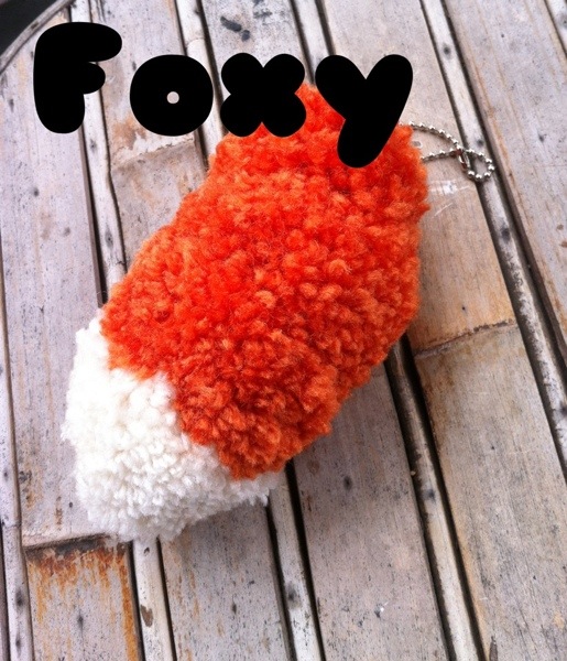 Time to carefully remove the rings, you can rip them right off, but only if you want to cut out more circles with little holes in the middle. For the foxy tail, you need 3 orangey foxy coloured pom poms and one cream, all the same size. Now a long sharp, big holed needle like a tapestry needle is used to sew the 4 pom poms together, nice and tight, but in a nice row, tail like. Now the fun and messy part, the trimming of the tail. A visit to the tail salon for a nice shaping trim. I tied a ball chain on to hang my lucky foxy tail.