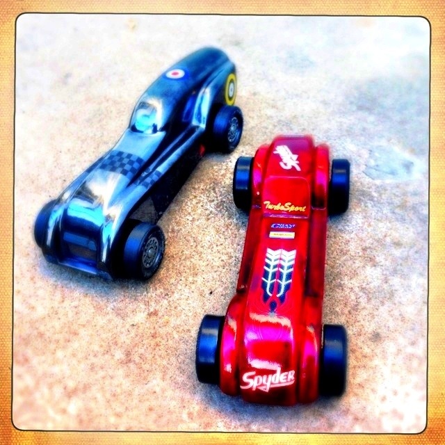 Day 26. Together. Bodhi and Max’s Pinewood Derby Cars. Bodhi 2013 design winner, Max 2008 design winner.
