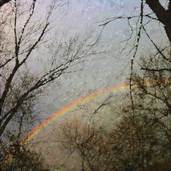 This photo is cropped using the square cropper in Camera +. I cropped it to highlight the rainbow and frame it with the winter trees.