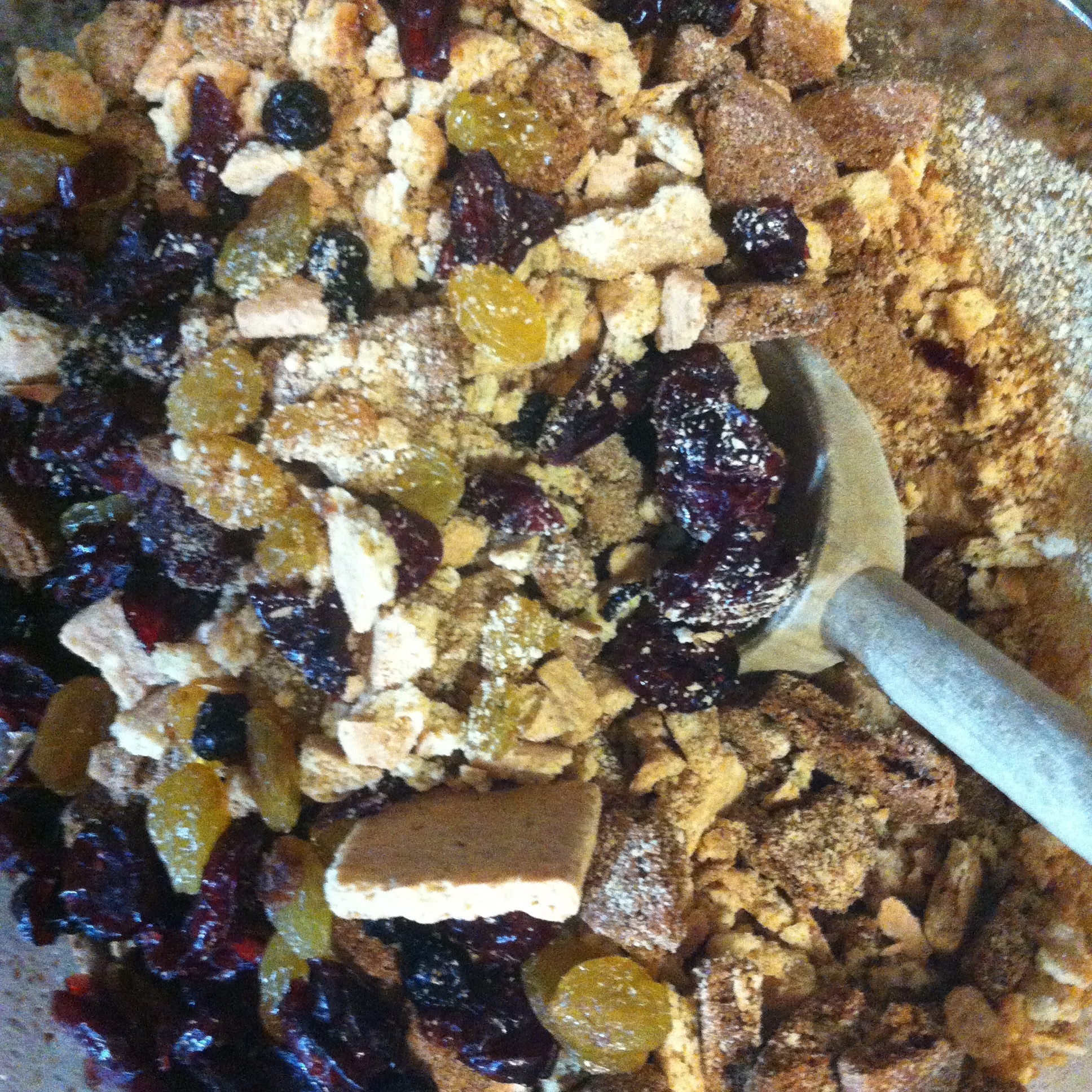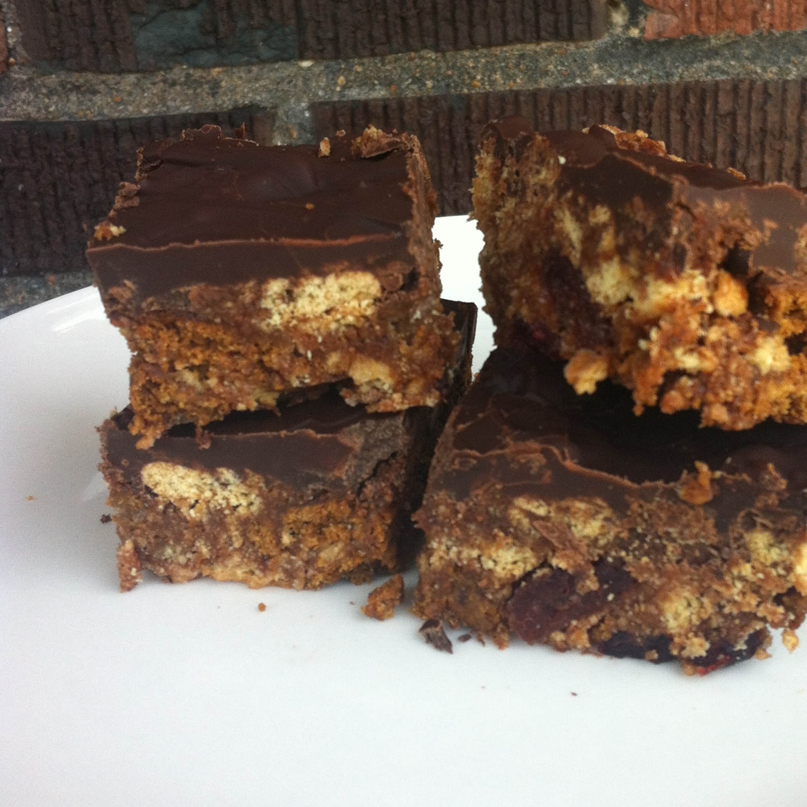 Melt the butter and honey/syrup, add the drinking chocolate powder and vanilla. Crush the biscuits into little chunks. I put them in a zip loc bag and bash them with a rolling pin – be careful not to make a load of holes in the bag though.