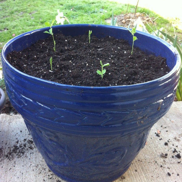 The baby Sweet Pea plants have grown big enough to go and live in the big blue pot.