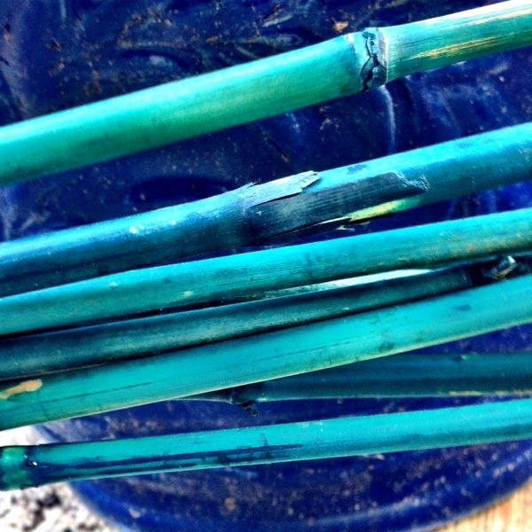 I grabbed the green bamboo poles from the shed.  Ready to build the Sweet Pea climbing frame.