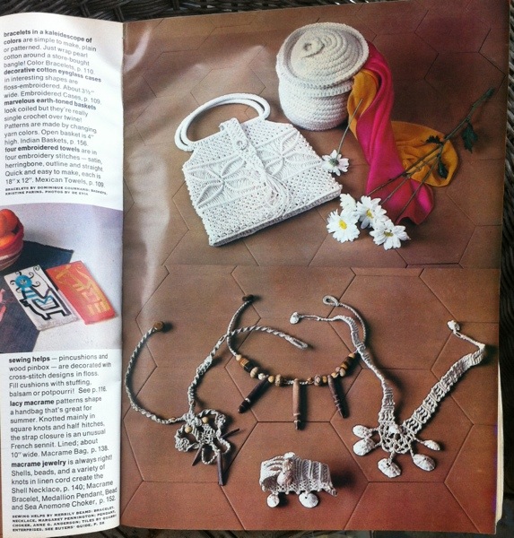 Of course I adore these macrame pieces.  I think they are a little bit cool, even the tiles they are photographed on are cool.  I love the statement on the opposite page ‘macrame jewelry is always right!’  Maybe I will steal that tag line for my catseatdogs jewelry!