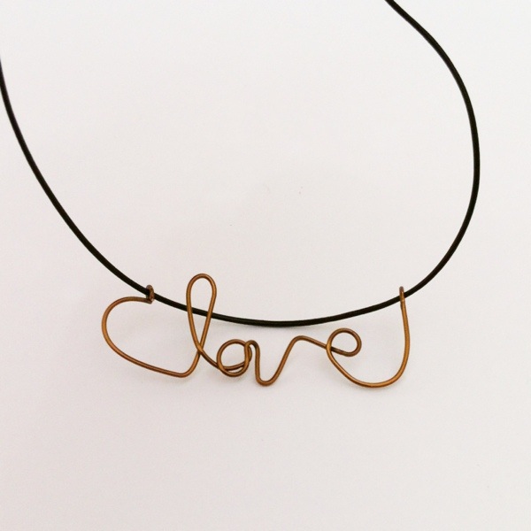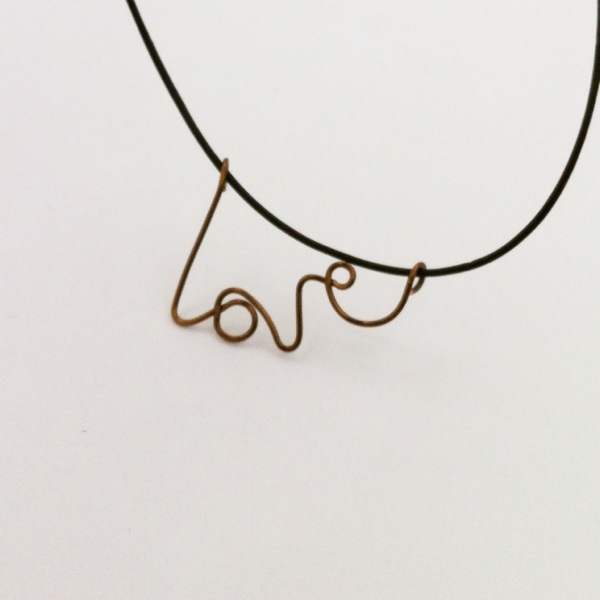 Back on track, I pulled out the wire and decided to do some writing! Here is ‘love’ in antiqued bronze wire on a leather cord.