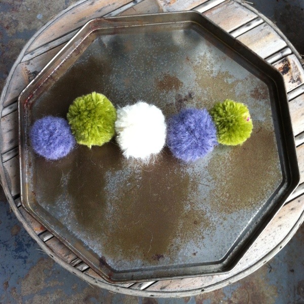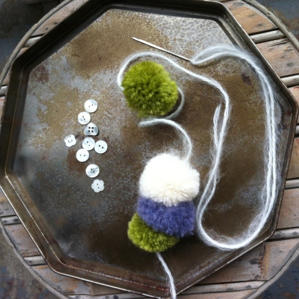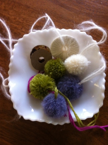 So, I made some little pom poms with some random balls of wool from The Upcycle Exchange. Go here to see how to make cutesy pie pom poms. I ended up with a little pile of successful ones, some wool doesn’t lend itself to a good fluffy pom pom, so a few fails are to be expected.