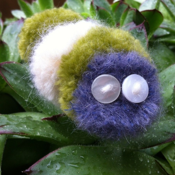 I threaded the pom poms together and pulled the wool so that they all smushed together in a friendly manner. At the head end I attached two button eyes and in the middle of two pom poms went the heart button.