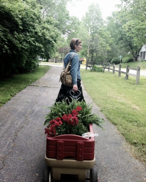 Pulling the hanging baskets and flowers home in the wagon.