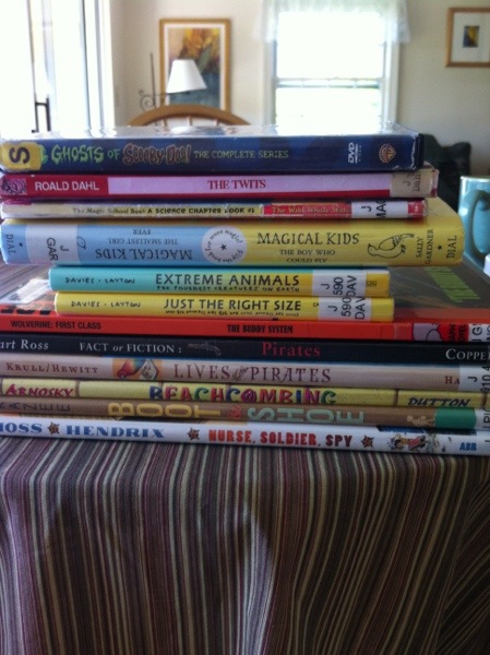 We joined the Eldredge Library in Chatham and borrowed a pile of books and DVDs to keep us entertained! Roald Dahl, Scooby Doo, some animal books and some pirate books.