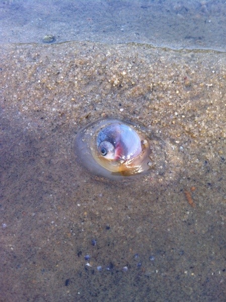 Here is a lovely slimey Moon snail. I learned that they can drill holes into other shellfish in order to eat them up. Which explains the perfect round holes in some of the shells we have found. Delicious!