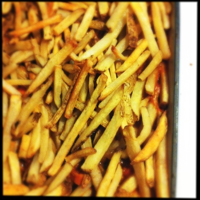 I put the chili into a shallow oven proof dish and piled the fries on top and put the lot back into the oven and cooked it for 10 mins. You could melt some cheese over the whole lot if you fancy. In my opinion cheese and chips is just wrong, but I do not judge. Sour cream is also an option. Treat yourself! Or just use low fat sour cream (not low fat cheese, that is so wrong).