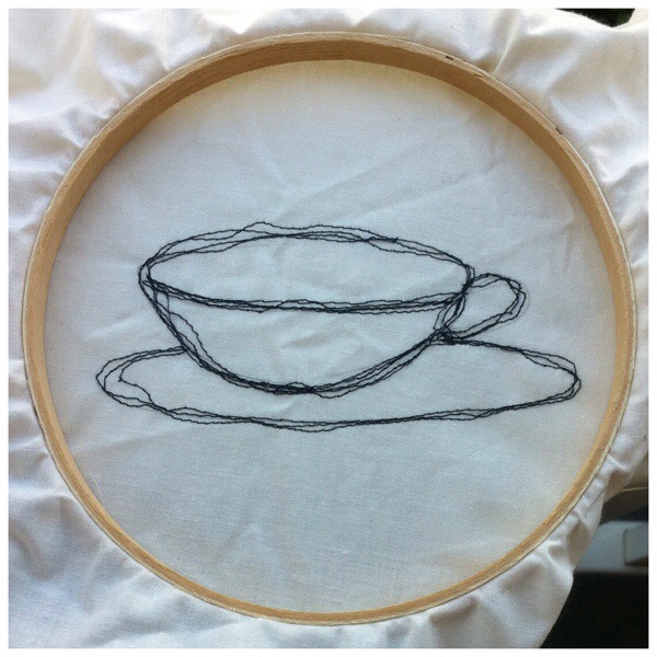 I did a quick sketch of a tea cup and found instructions in my sewing machine’s manual.  The fabric went into my embroidery hoop and off I went.