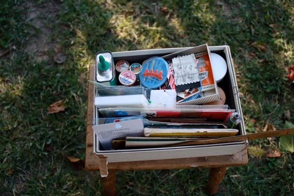 A box full of sewing treasures found at a basement sale.