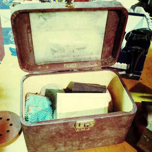 I came across this shabby case full of life at a junk shop today. There were purses, a powder compact, books and an address book stashed within.