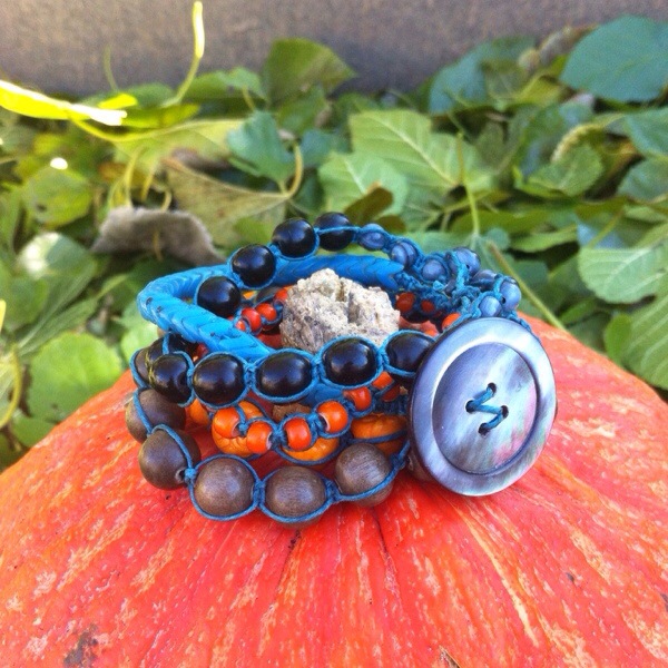 This bracelet sitting on a pumpkin is a chunky casual wrap made with wood, lucite, grey mother of pearl and some gorgeous blue snake beads. One of the constants in these bracelet is that they all fasten with a careful chosen vintage button, many of which are mother of pearl, all of which are lovely.
