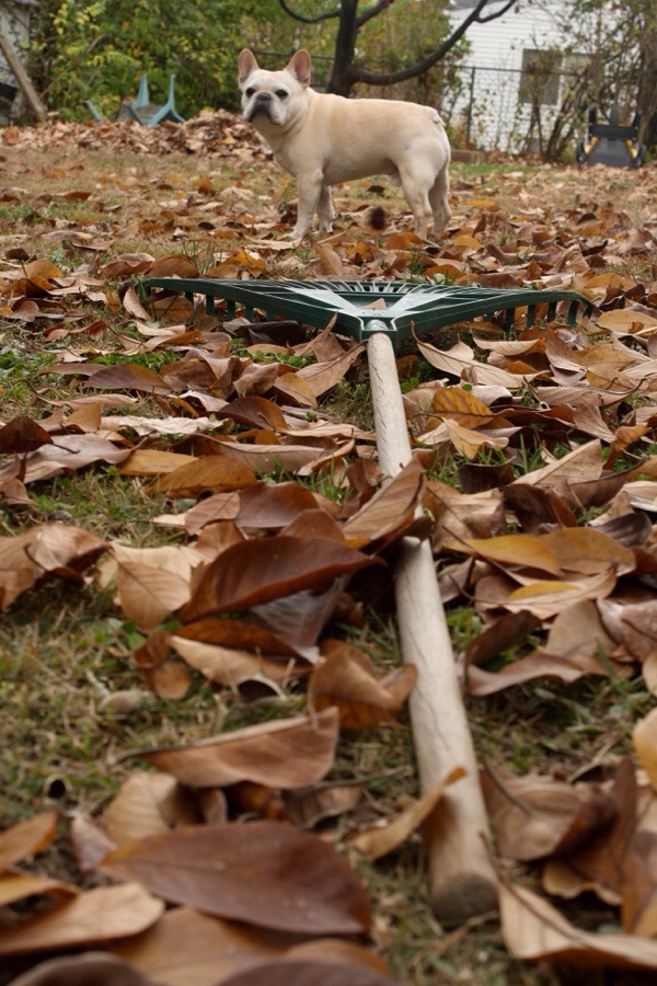 20131118-093137.jpg 11/365  I was taking photos of the rake in the leaves to practice with my camera and the dog wandered in to glare at the rake.