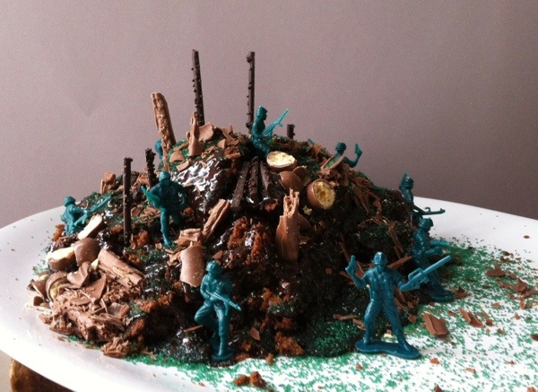 I added toy soldiers, green sanding sugar, crushed Maltesters, Ripple bars and chocolate twigs (like Matchmakers in the UK).