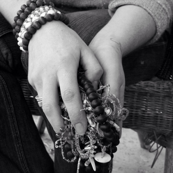The bracelets and necklace in my hands are new at CatsEatDogs and I love them for spring and summer.  Layered up your wrists, they add colour and texture to any outfit.  I am also holding a string of wood beads, I intend using lots of lovely wood in necklaces and bracelets this season.