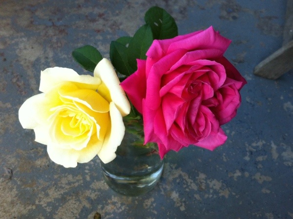 7. My neighbour was cutting her roses and gave me these two, they are so pretty, look at the pink one, it has three blooms in one.