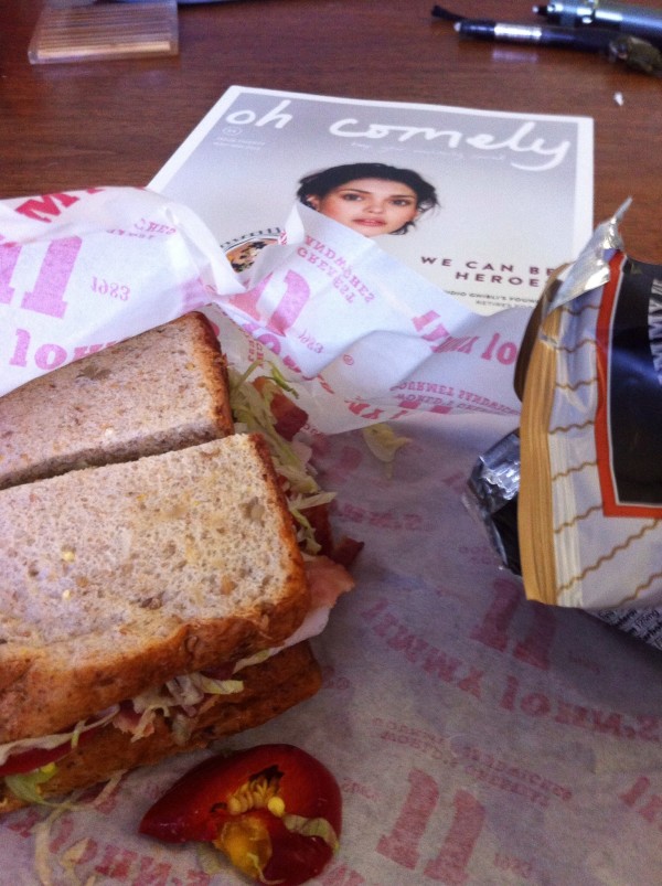 1. Lunch. Jimmy Johns delivery sandwich while I have a quick peek at Oh Comely magazine.