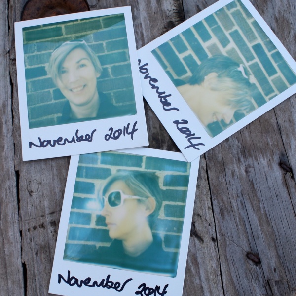 My hair is almost all ‘natural’ now, only about half an inch of colour left at the ends of my fringe.  Last time I got it cut, I nearly went shorter just to get the dye out, but decided to wait a little longer and keep the style I like.  I snapped a few polaroids today to show you where the grey is.