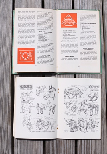 1. A party recipe book from the 1950’s and a how to draw animal book. The recipes are classic and bizarre like ‘meat loaf’ and then over the page is ‘rice with avocado sauce’.