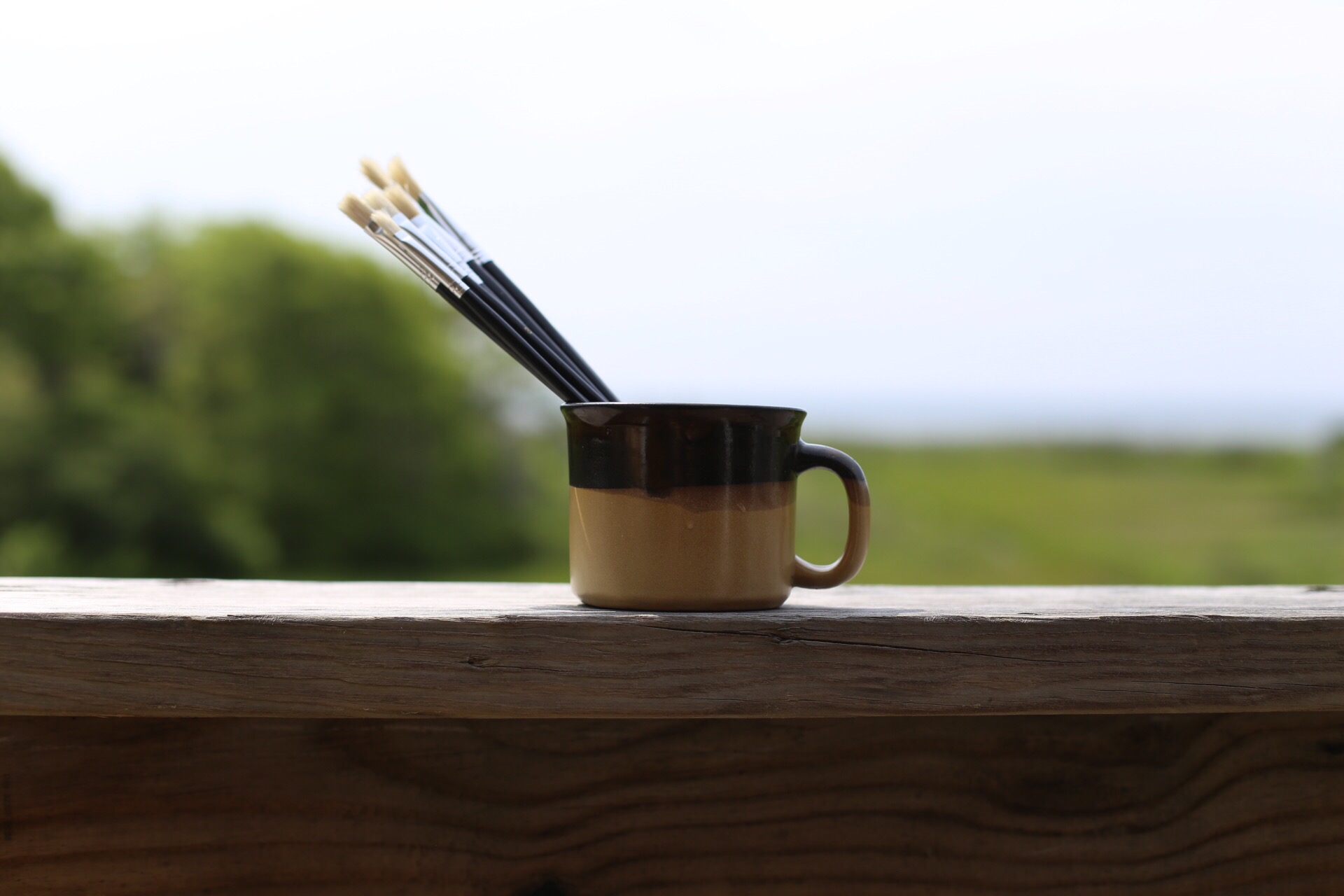 3. At a yard sale I picked up this coffee mug and at another yard sale I spotted the brushes. They are not Van Gogh standard but handy for glue and painting backgrounds.