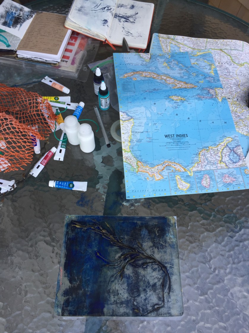 My art desk on the deck! Gelli printing seaweed into my art journal and onto old atlas paper.