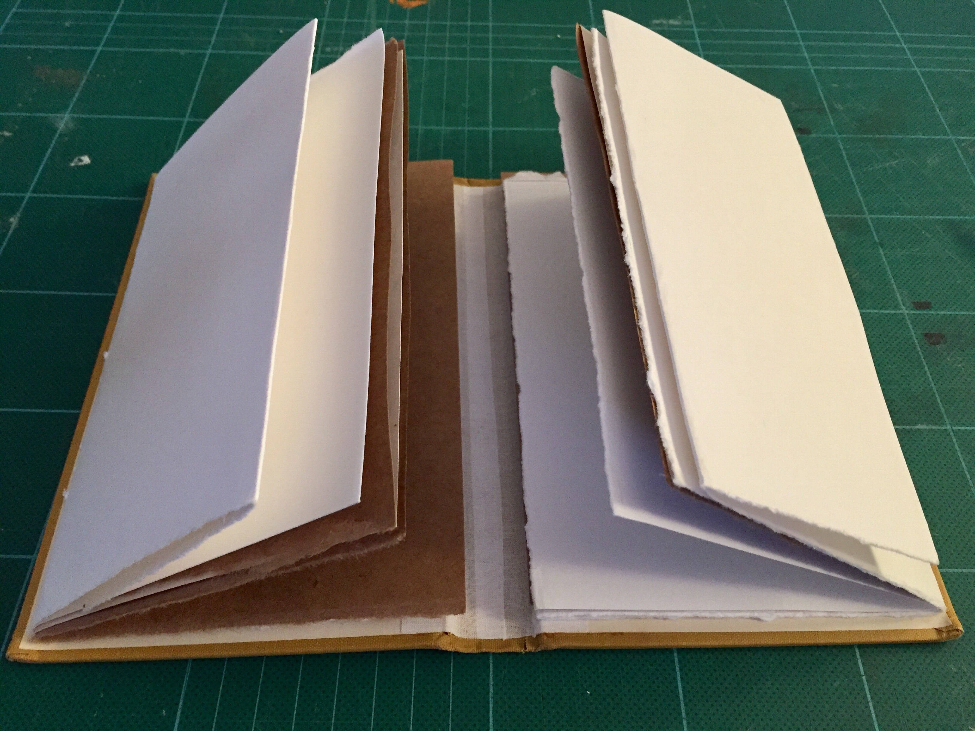 I made two signatures and stitched one to each inside cover of the book so they open away fro each other.  I used pamphlet stitch to fasten them onto the edge of the cover.