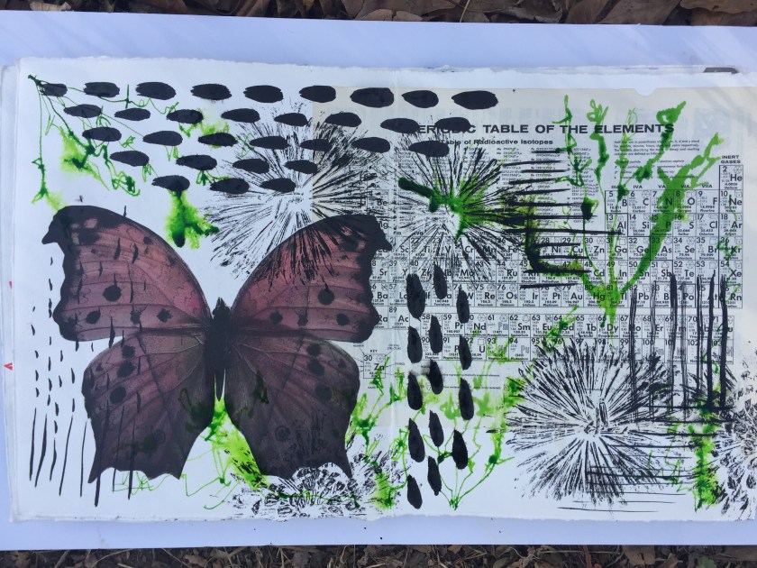 Some of the pages were printed before I bound this book and some I have printed over collage elements, like the last page shown here where I stuck down the periodic table and butterfly and then printed some flowers on top.