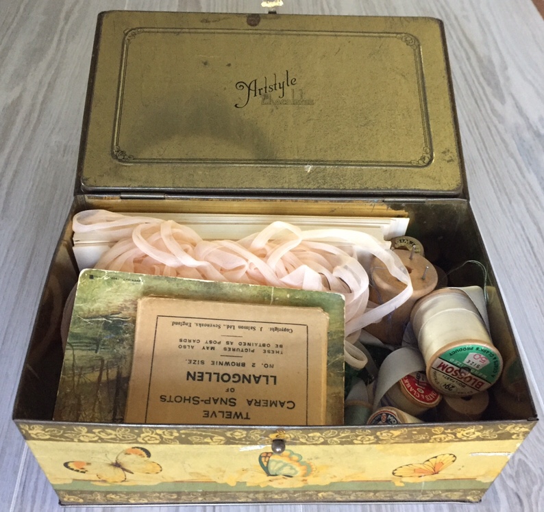 This vintage chocolate tin has accumulated stuff I have collected and once it was full, I left it full of treasure. When I was a kid I used to collect cool things in a wooden box and I loved to look through it. This reminds me of that as I don’t take anything out or add anything but I do like to look through the tin every so often.