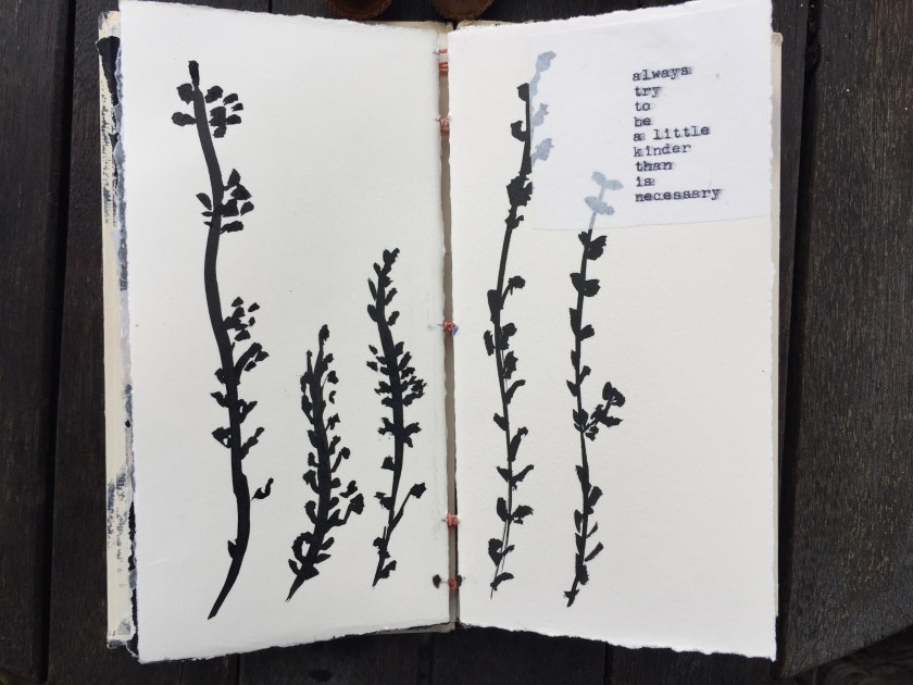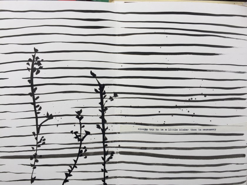 These pages were created pretty quickly using a sumi brush and sumi ink with a little water. I typed the quotes onto vintage typewriter paper and glued them down.