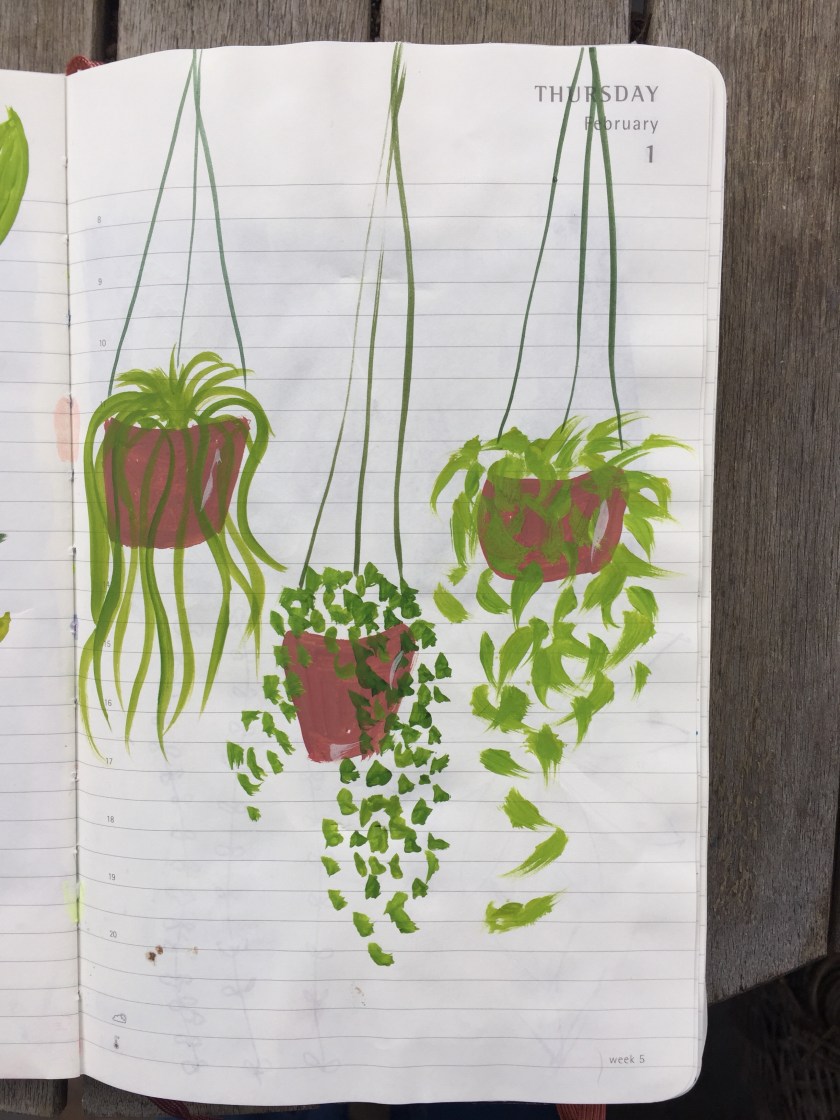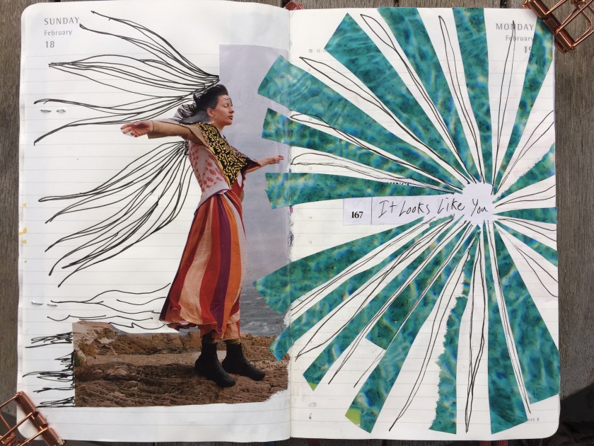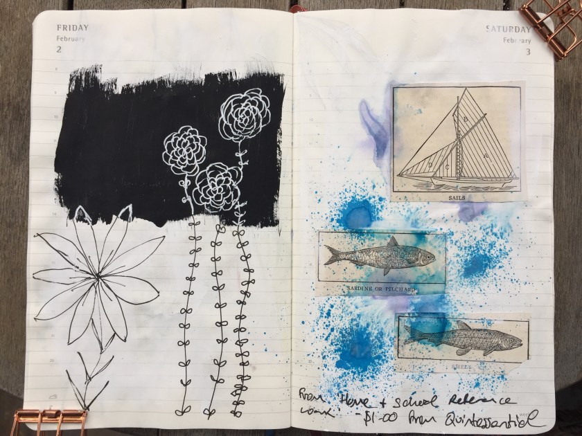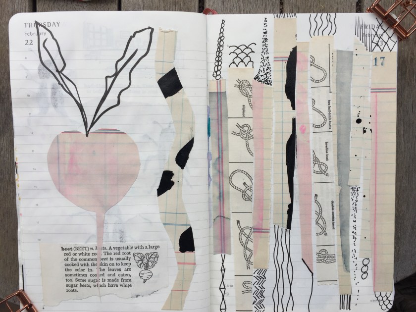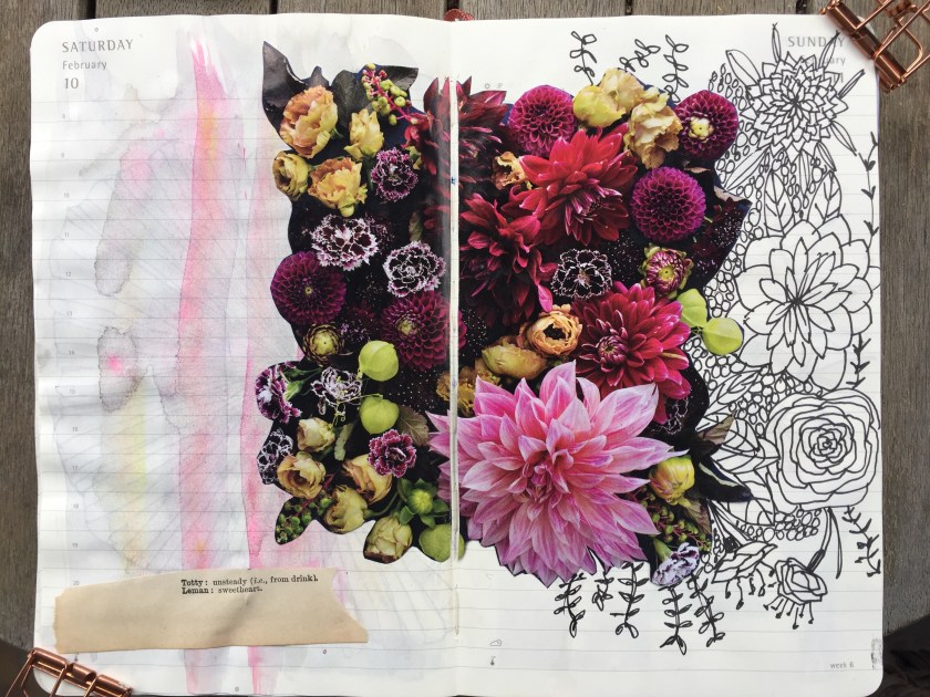 February pages went swimmingly! I like almost all of them (which is frankly more than I can say for the January pages). The beginning of my Moleskine daily planner is starting to get full and the pages are getting crinkly with arty stuff!