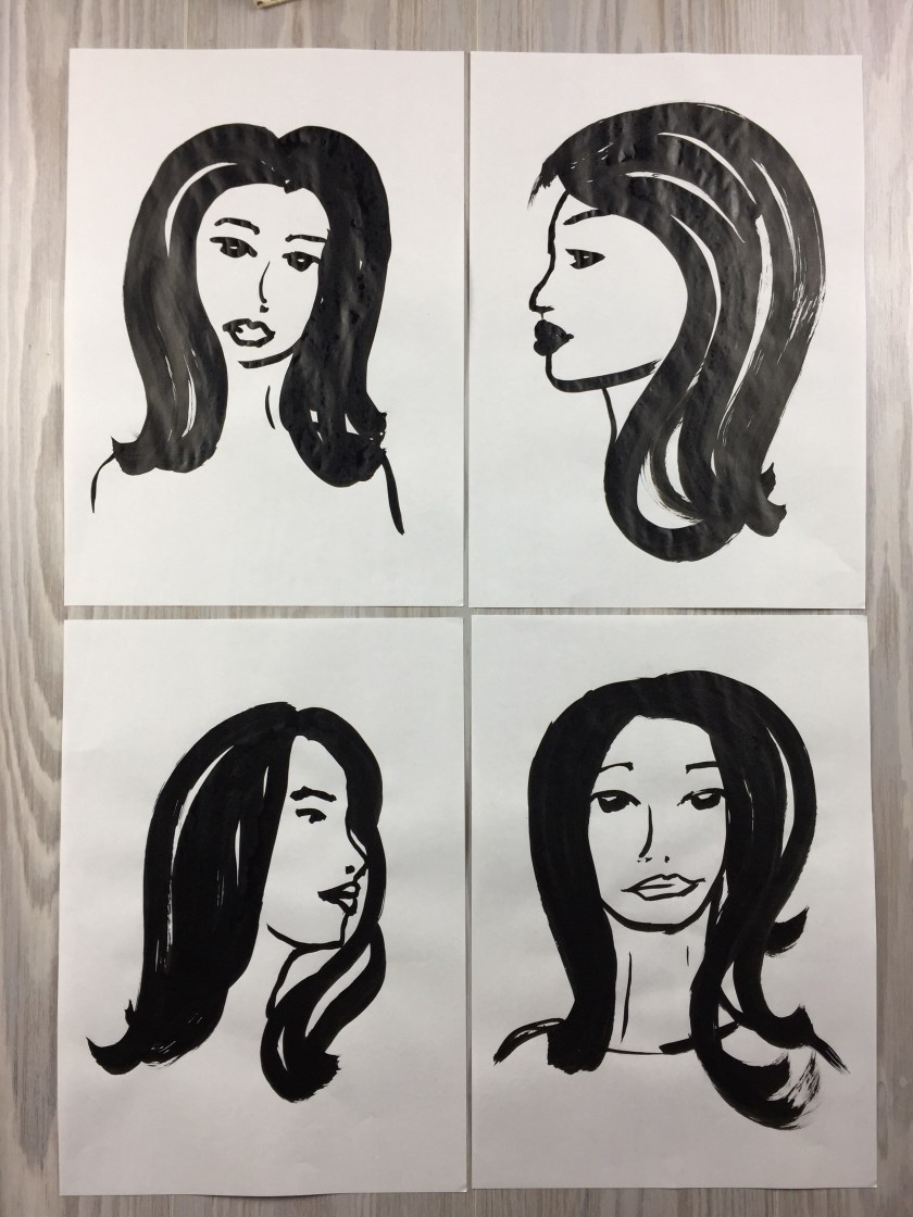 The top ladies are painted in black ink using a sumi brush and using a template provided by Katie which I put under my paper as a guide. I like to put my own style on my faces and I am learning so much from this class and getting more confident at faces which are not straight on, like profiles and turned to one side slightly. I used my new favorite paper for these sketches which is ‘Tomoe River’ paper, it is lightweight but still stands up to ink without warping too much.