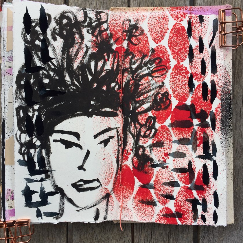 The last girl has painted botanicals in her hair and I used a stencil with ink in a mister to get the red background, finally I went in with my sumi brush to make some marks with blue/black ink.
