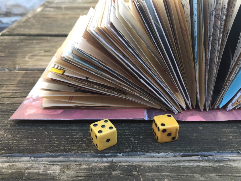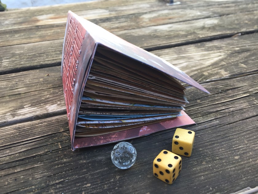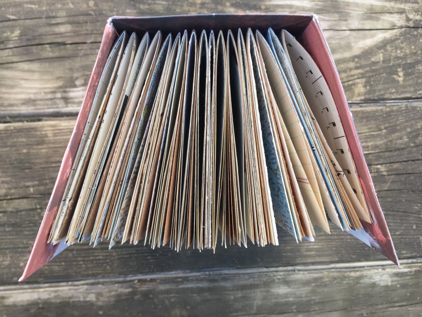 I used a fancy paper bag as the cover which I reinforced with a cereal box and I cut and folded 17 signatures each with five sheets. The pages are from an old cookbook, an encyclopedia, an old National Geographic, an atlas, a photography book, some music and pages from a 1952 ledger.