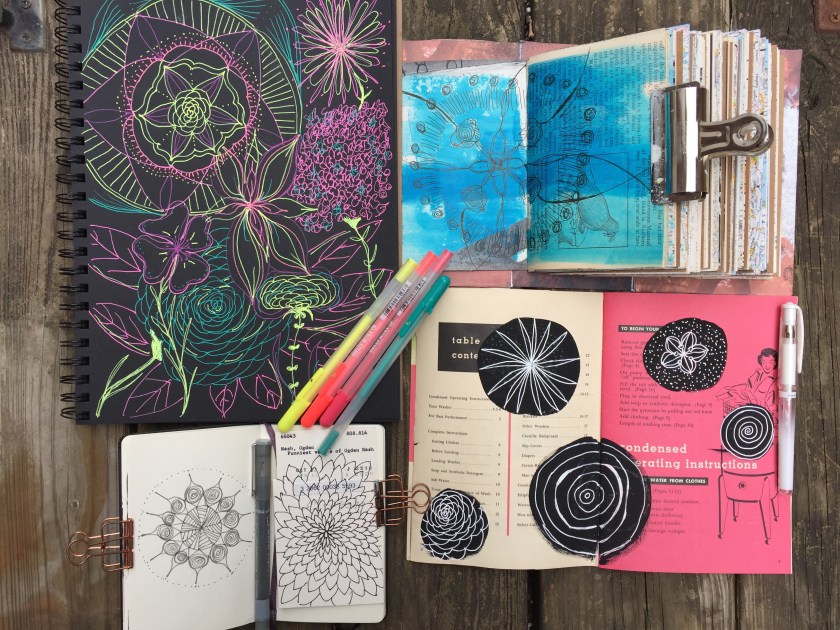 Some are in art journals, a Moleskine sketchbook, a handmade sketchbook, a vintage library card, on an old black and white photo and on a sheet of ledger paper.