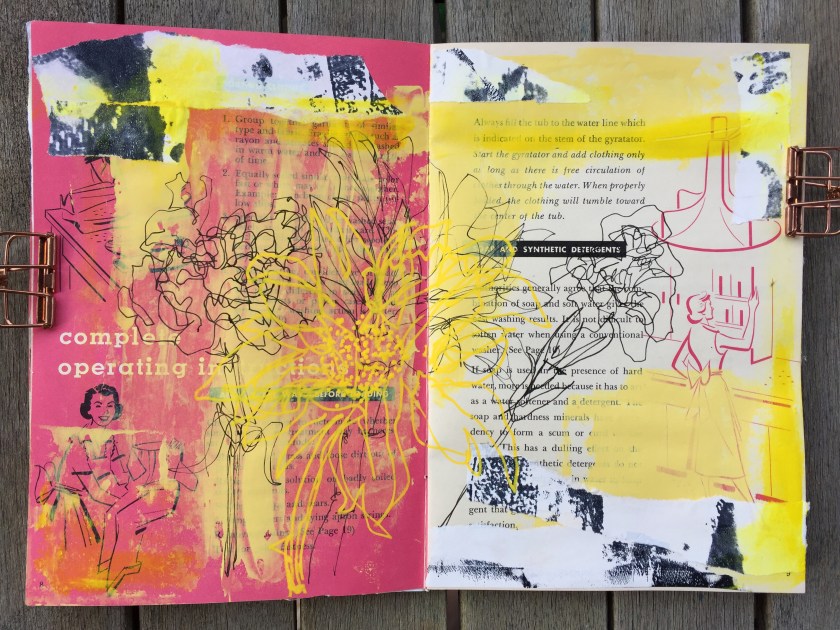 I felt like I was neglecting my little art journal for the Season of Play at Get Messy this week. So one evening I picked it up along with some collage pieces I had chosen, cut out and left to one side. Rather than wait for inspiration to strike I decided to just go for it and make a page with these ladies, a constellation map and some butterflies with a few swipes of paint. I have also just signed up for Sketchbookery so I did a little sketching practice on this page too in the form of a flower blind contour drawing or three.