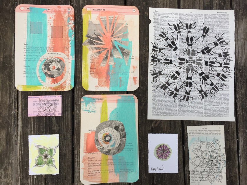 Of this 10, I like the trio of collaged mandalas on the vintage math cards best and I also like working on the small watercolour cards, they are just the right size. I used the watercolour cards while I was in the UK and they worked really well. There is one missing and that is the mandala I drew on a coffee cup on the train!