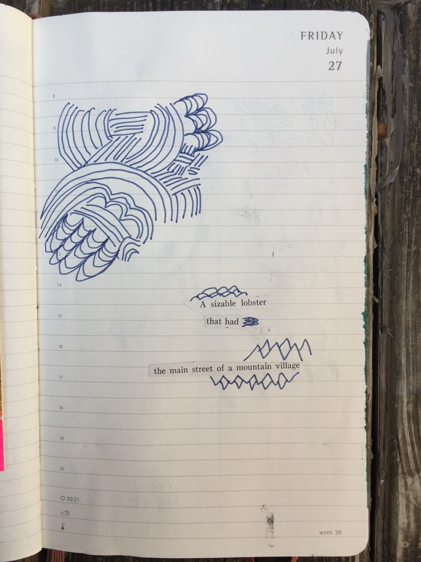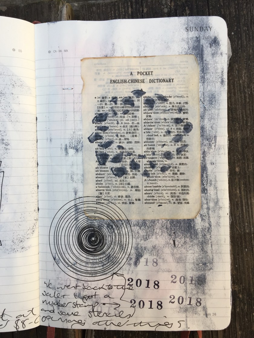 In July’s pages I have been continuing my stamp making and playing, practiced some faces (not sure what everyone is looking at on the last pages!), adding some simple collage elements and messing about generally.