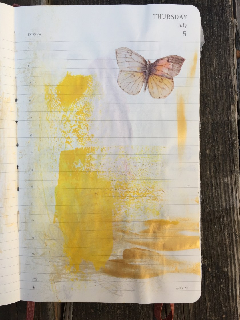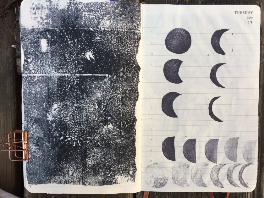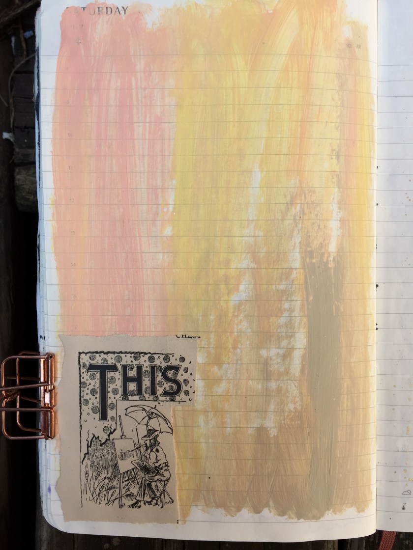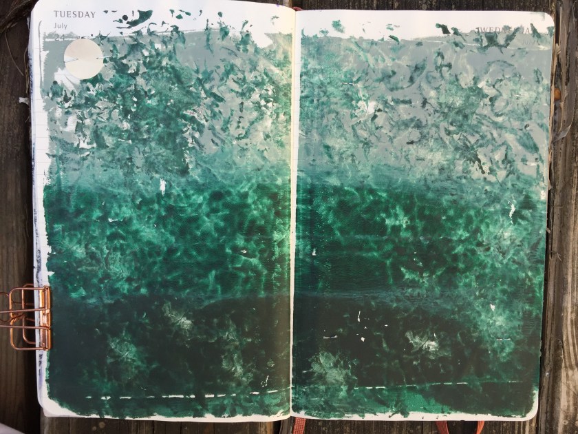 This is one of my favourite things about this practice, I get to just play, the paper in this book is thin and the pages end up crinkly and with the image before or after showing through, and because of this there is no pressure. If I want to paint face with strange hair and wild eyebrows, I will and I will pretend that is the image I was going for. Ha! This is where I will try new supplies and ideas, I will test a new stamp or stick in a fresh gelli print or print right onto the page. It is a wonderful and precious record of where I am at and what I am doing with my art. Wild eyebrows and all!