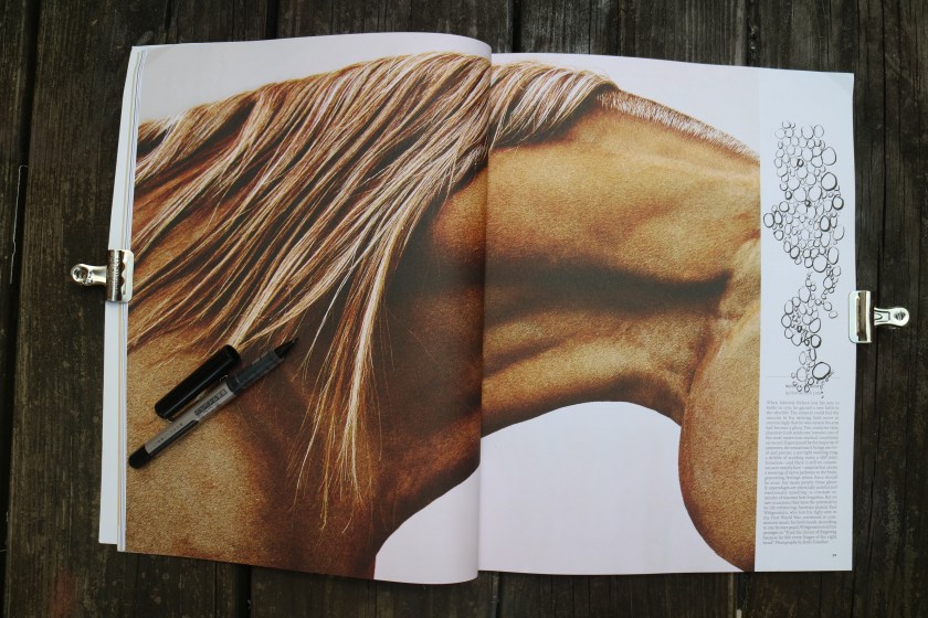 I read the articles and then sketched or made some marks depending on what I thought I wanted to do on the page. I didn’t want to draw on this horse so I doodled a few circles.