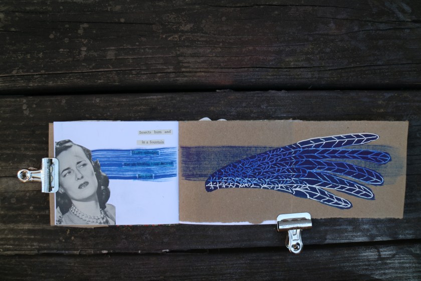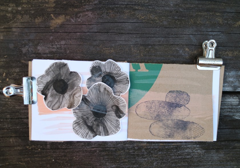 I have been adding all of my current favourite things, collage, pebble stamps and found word poetry and just letting myself get on with it without any restrictions. The good thing about using a small journal with only a few pages is one is soon full. In fact I am thinking of concentrating on a specific idea for one journal at a time. I love using my pebble stamps to make piles of rocks and I am planning to dedicate a whole tiny journal to using these stamps.