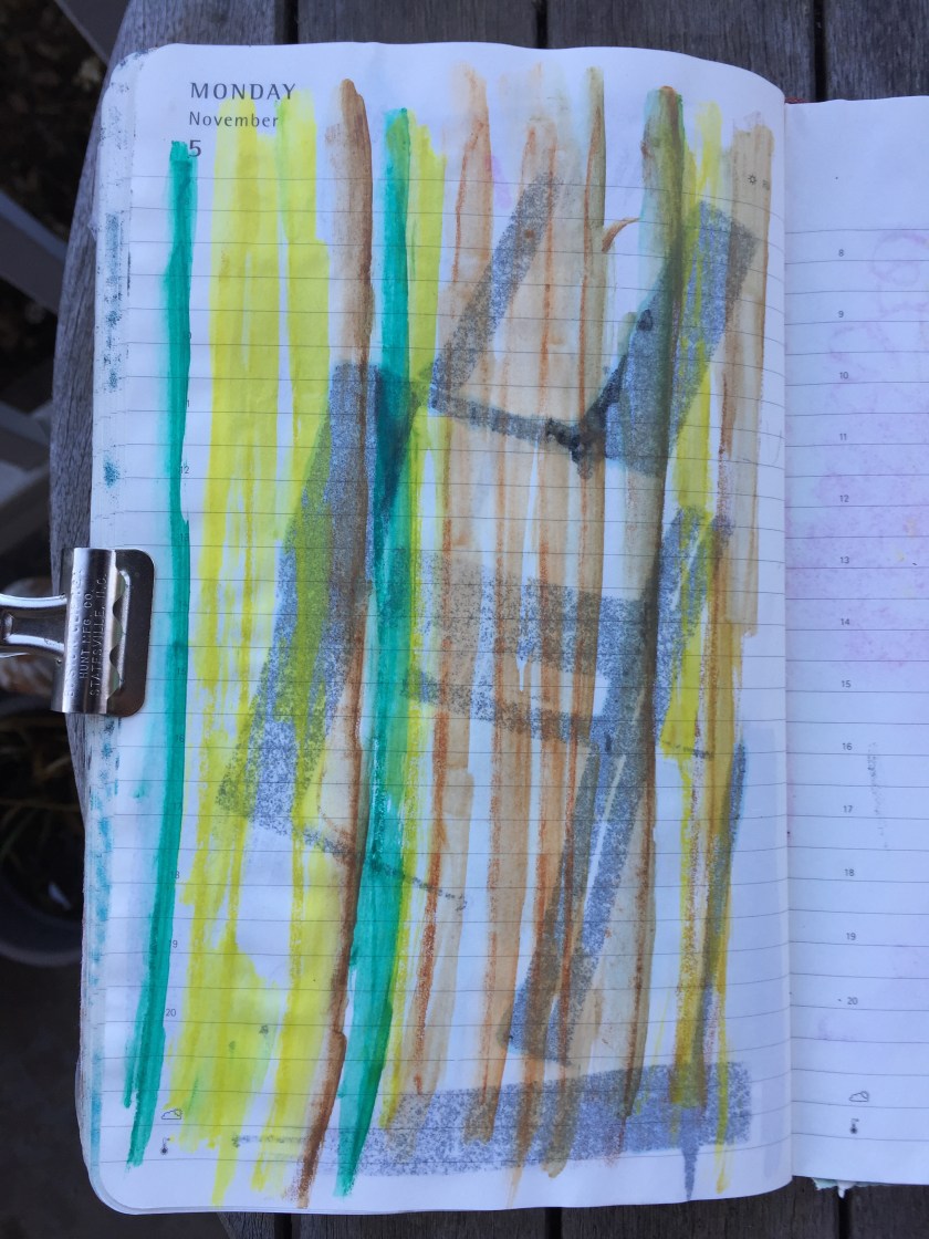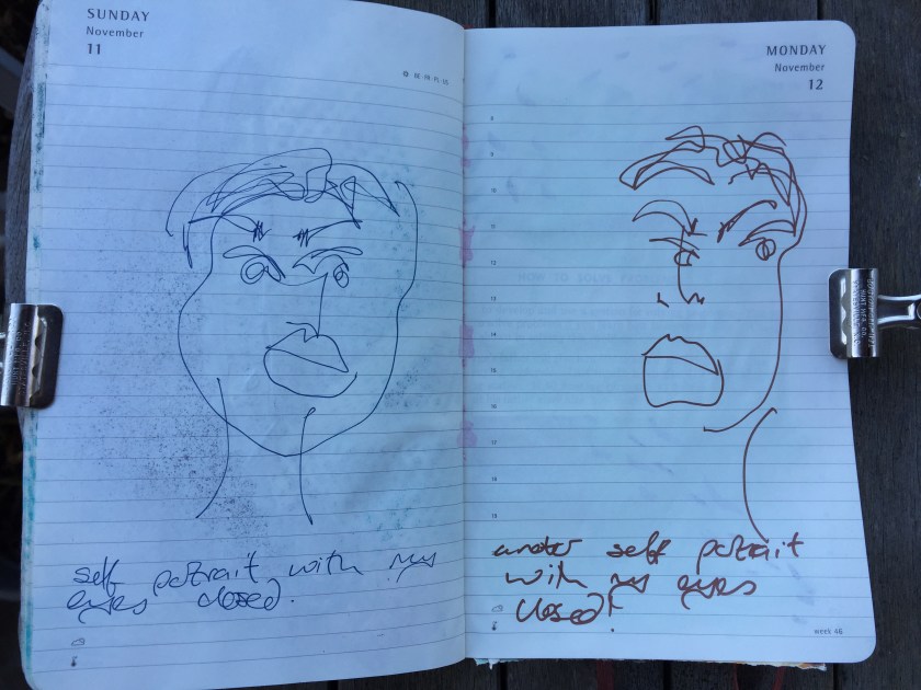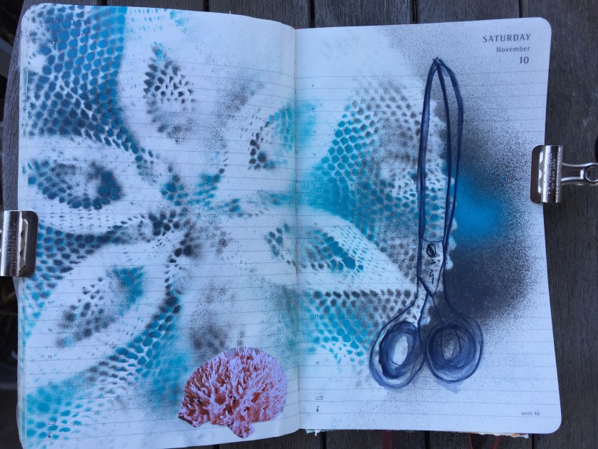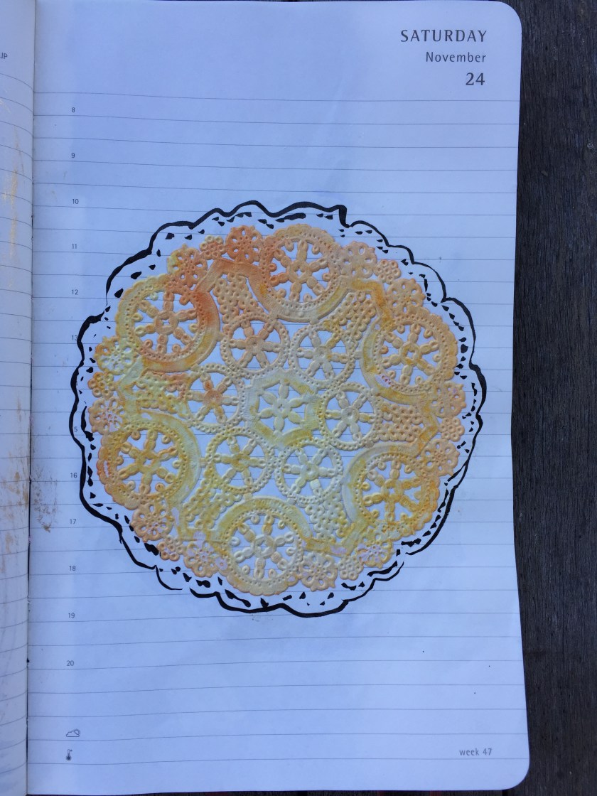 Last month in my Moleskine daily planner, I stuck stickers, found leaves, spray painted through old doilies, sketched hilarious self portraits and tested new supplies.