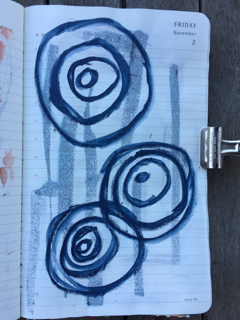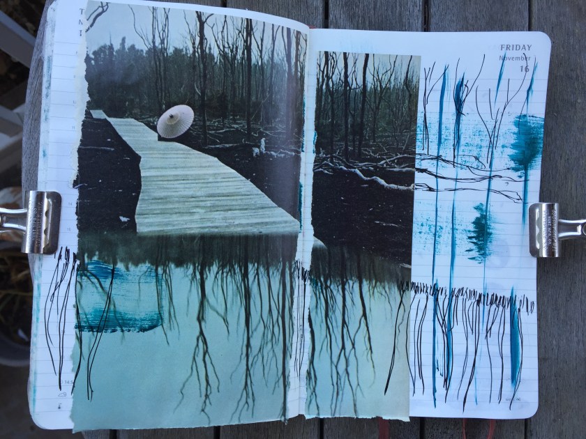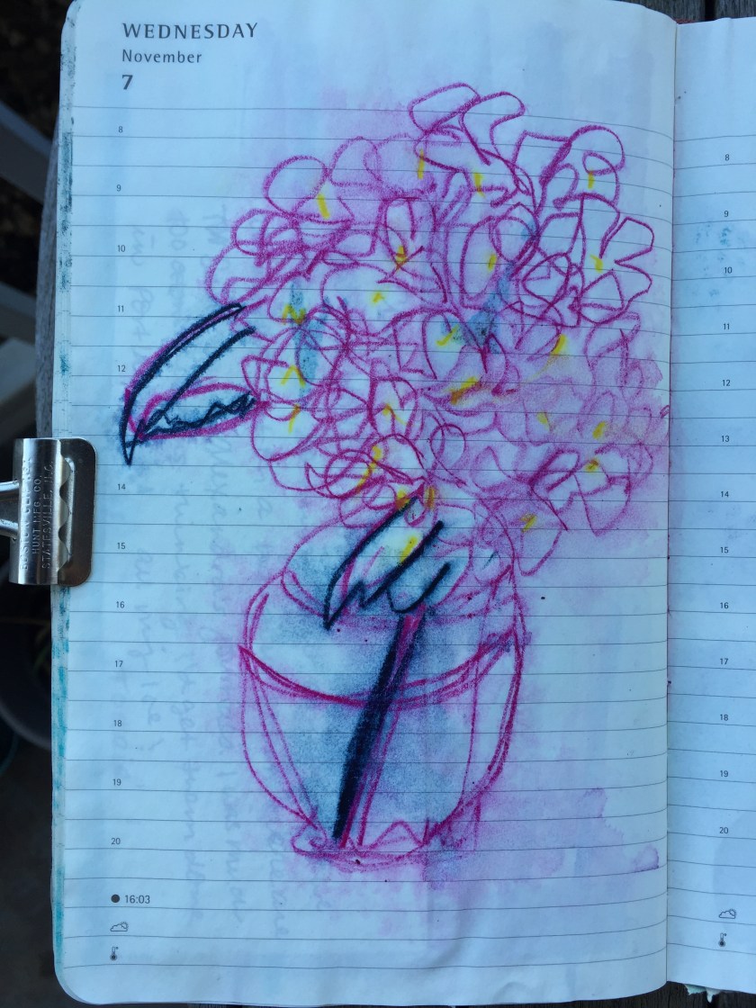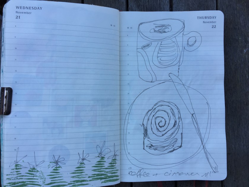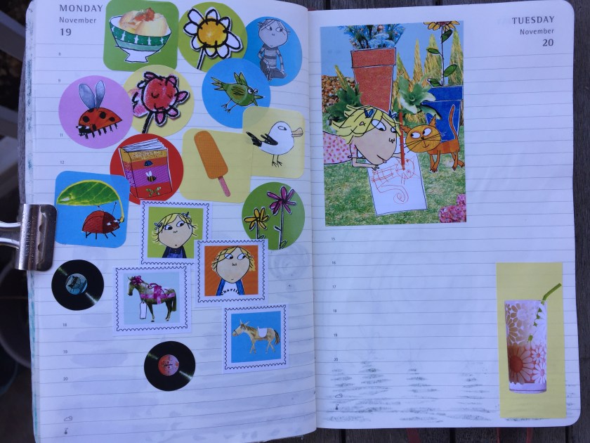 Last month in my Moleskine daily planner, I stuck stickers, found leaves, spray painted through old doilies, sketched hilarious self portraits and tested new supplies.
